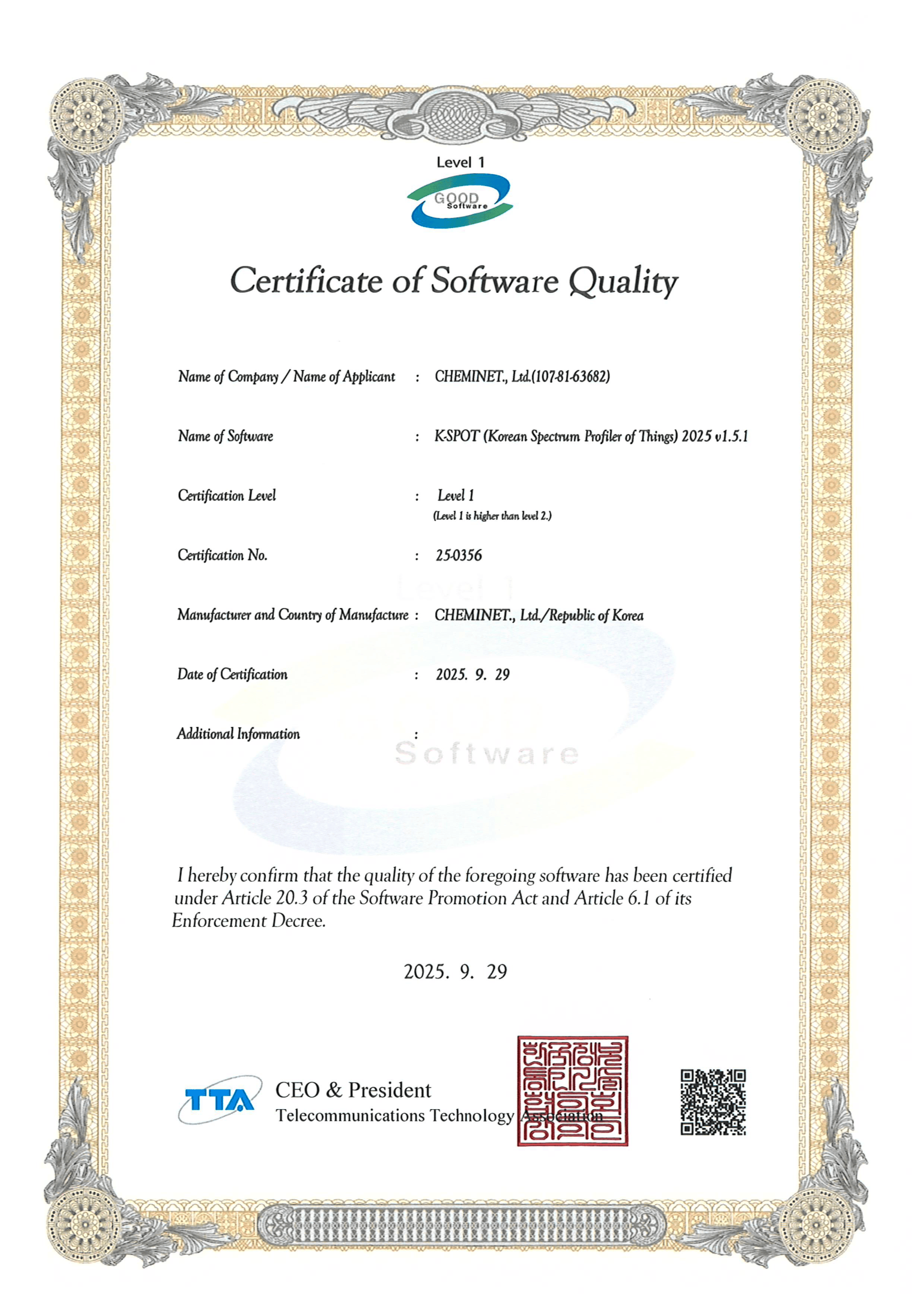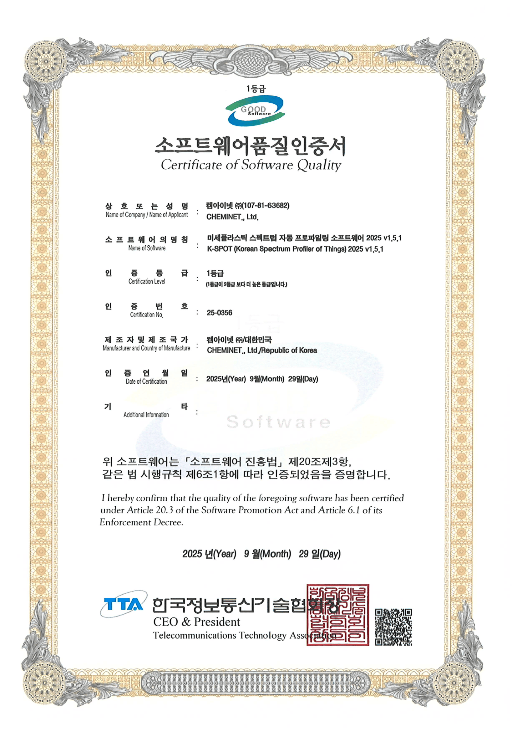 2025년 9월 29일, 미세플라스틱 스펙트럼 자동 프로파일링 소프트웨어인 'K-SPOT 2025 v1.5.1'이 한국정보통신기술협회(TTA)로부터 GS인증 1등급을 획득했습니다. 소프트웨어의 품질과 안정성을 국가적으로 인정받은 결과입니다.